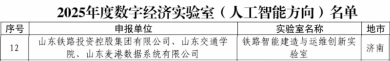 日前,山东省工业和信息化厅公布了2025年度山东数字经济创新平台名单,集团牵头申报的“铁路智能建造与运维创新实验室(人工智能方向)”成功入选,成为本次25家获批单位之一,标志着集团在人工智能关键技术研究与创新应用方面迈出了坚实一步。