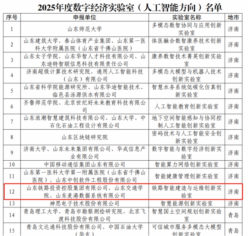 日前,山东省工业和信息化厅公布了2025年度山东数字经济创新平台名单,集团牵头申报的“铁路智能建造与运维创新实验室(人工智能方向)”成功入选,成为本次25家获批单位之一,标志着伟德国际victor1946在人工智能关键技术研究与创新应用方面迈出了坚实一步。