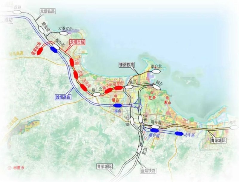 龙烟铁路市域化改造工程位于烟台市境内,是山东省重点铁路交通项目。工程利用烟台市内既有龙烟铁路、蓝烟铁路富余能力进行市域化改造,东起烟台站,西至烟台西站,通过新建蓬莱国际机场支线在烟台西站接轨,连通蓬莱机场站,线路全长46.6公里,其中:新建桥梁10.52公里,隧道9.04公里,桥隧占比41.6%。全线新建福莱山、柳子河、古现南、古现、八角、蓬莱机场6座车站,改建烟台、珠玑、福山北、烟台西4座车站,项目可研批复总投资75亿元,2024年9月底开工建设,计划2027年9月底建成通车。通车后,将以开行市域化公交列车的形式,串联起烟台站、烟台西站、蓬莱机场站等交通枢纽,是山东省首条市域铁路。