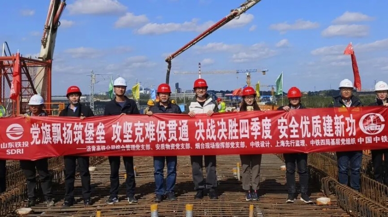 在浇筑现场,烟台交通“党建+”共同体还同步开展了“党旗飘扬筑堡垒 攻坚克难保贯通 决战决胜四季度 安全优质建新功”主题党日活动,各支部党员代表共同见证连续梁浇筑过程,从火热的建设实践和攻坚克难的奋斗精神中汲取力量,进一步激发“建功在一线”的昂扬斗志。