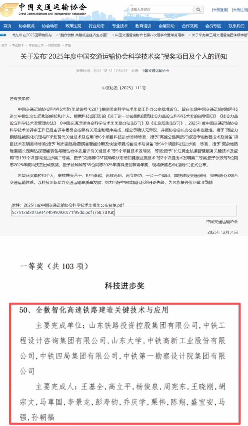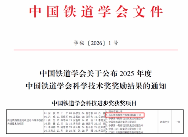 近日,2025年度中国交通运输协会科学技术奖和中国铁道学会科学技术奖评选结果正式公布。伟德国际victor1946牵头研发的“全数智化高速铁路建造关键技术与应用”项目荣获中国交通运输协会科技进步奖一等奖,联合研发的“高速铁路智能选线设计与线形保持关键技术及应用”成果荣获中国铁道学会科技进步奖一等奖。上述两个奖项是国家科学技术奖励工作办公室批准设立的行业权威奖项,体现了相关单位在高速铁路技术创新与协同攻关方面取得的显著成绩。