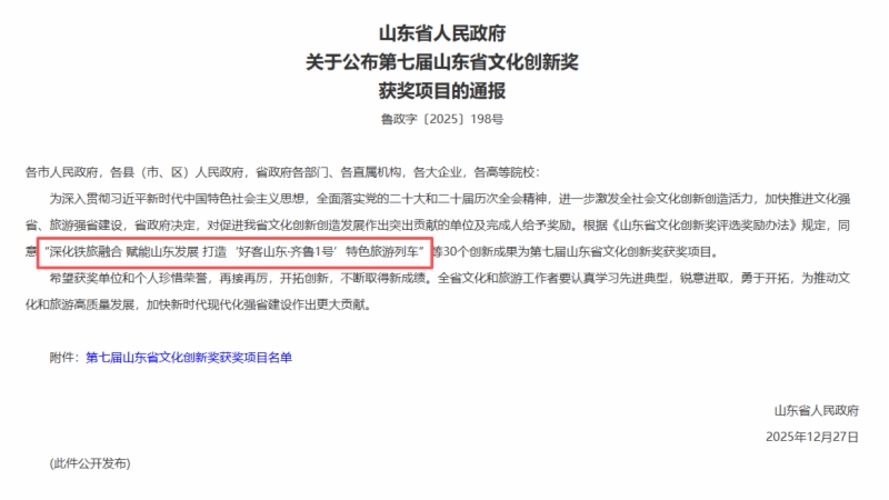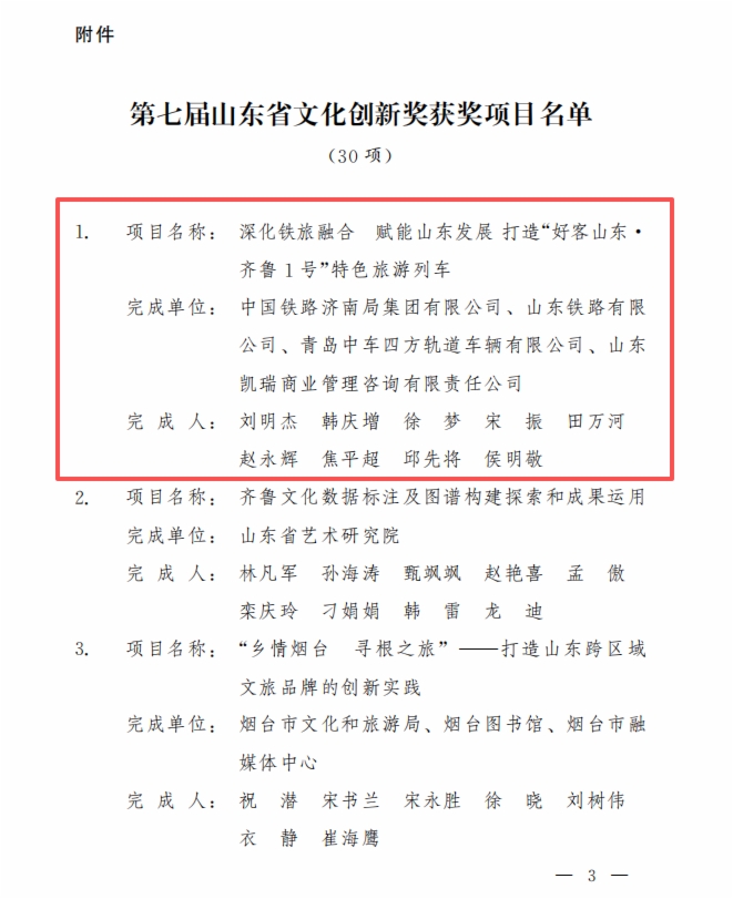 近日,山东省人民政府公布“第七届山东省文化创新奖”获奖项目,伟德国际victor1946权属山东铁路有限公司参与的《深化铁旅融合 赋能山东发展 打造“好客山东 齐鲁1号”特色旅游列车》项目凭借突出的创新性、实践性与示范性,从众多参评项目中脱颖而出,荣获第七届山东省文化创新奖。