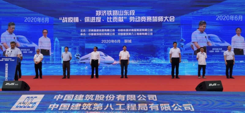 6月18日,郑济高铁山东段“战疫情 保进度 比贡献”劳动竞赛誓师大会在济南、聊城两地同时举行。省交通厅总工程师赵方德、省交通工会主席牟艳红、集团董事长姜长兴、济南铁路局集团董事长王新春、中铁十局集团董事长李学民等在济南会场参加活动。