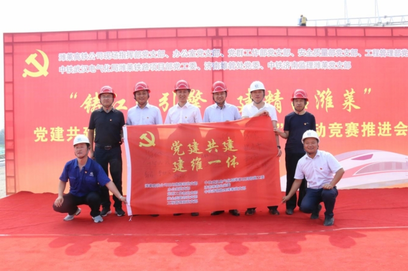 为庆祝中国共产党成立99周年,掀起潍莱高铁四电施工大干热潮,7月2日,济青高铁公司办公室党支部、党群工作部党支部、工程管理部党支部、安全质量部党支部、现场指挥部党支部,联合中铁武汉电气化局潍莱项目部党工委、济南维管处党委、青岛维管段党工委、中铁济南监理潍莱党支部,开展“铸红色引擎,建精品潍莱”党建共建暨“百日大干”劳动竞赛推进活动,形成合力打造高铁工程“建维一体”化。