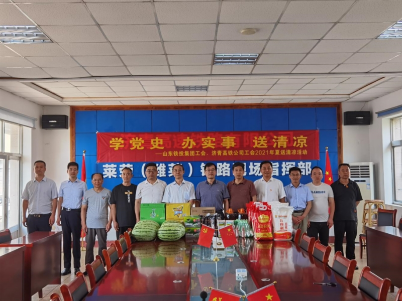 为贯彻落实各级工会关于开展好“送清凉”活动的有关要求,切实维护好职工安全健康权益,体现集团和公司工会对广大职工的关爱,同时推动党史学习教育深入开展,学党史、办实事,7月14日-16日,济青高铁公司工会联合集团工会,赴莱荣、潍烟高铁建设一线开展“学党史、办实事、送清凉”活动。集团公司副总经理窦玉硕、工会主席张庆星,济青公司党委副书记、工会主席张富兵带队参加活动。