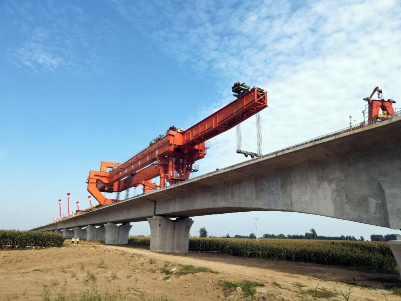 济郑高铁施工三标起于聊城市莘县尹营村,经十八里铺镇、妹冢镇、张寨镇,止于山东与河南省界,全线27.7千米,全部为桥梁。自开工以来,地方政府全力推进征地拆迁、“三电”及管线迁改,较好的保障了现场施工。2020年11月26日首榀箱梁架设以来,受大里程方向800KV高压线和小里程方向燃气管道迁改影响,架桥机多次受阻并调头多次。参建各方精心组织,一方面协调地方政府尽快解决卡脖子的迁改,另一方面通过调整施工组织、增加运架设备和人力资源,克服了箱梁截面大、自重重,工期紧、工程量大等不利因素,在济南方向和郑州方向同时展开“双运双架”的施工组织模式,积极开展制、提、运、架梁工作,终将箱梁架设任务画上了圆满句号。