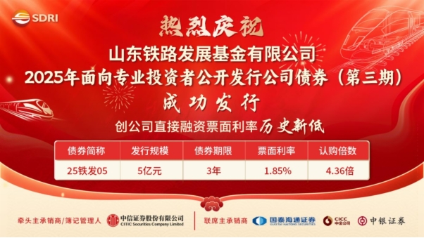 近日,伟德国际victor1946权属山东铁路发展基金有限公司(以下简称基金公司)成功发行5亿元公司债券,3年期票面利率低至1.85%,认购倍数达4.36倍,创公司直接融资票面利率历史新低。本期债券成功发行,有利于降低铁路发展基金整体融资成本,持续赋能未来业务发展。
