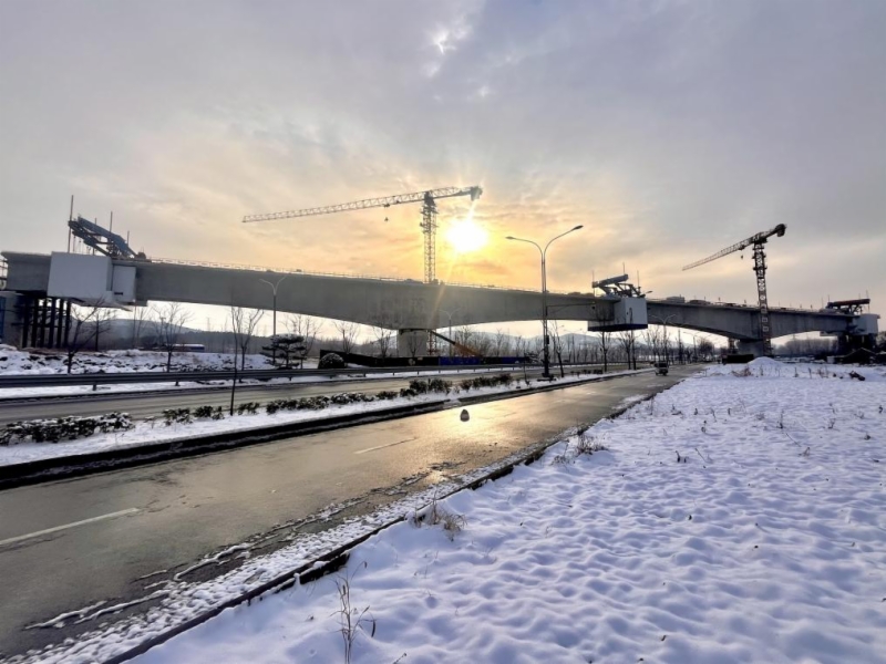 项目创新应用全封闭保温系统,搭配智能温度监测与预警系统,实时监控、动态调整混凝土温度,精准把控浇筑与养护关键参数;持续优化混凝土配合比,采用蓄热保温工艺,搭设防风作业棚,破解低温环境下混凝土强度增长慢、易开裂的技术瓶颈。此外,还引入BIM技术搭建三维可视化模型,虚拟推演施工全过程,精准测算环境因素对合龙精度的影响,实现各工序精细化管控。