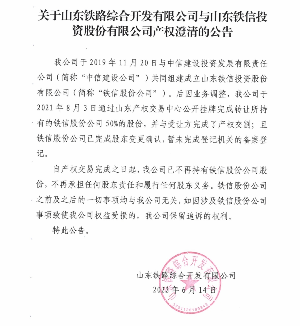 关于山东铁路综合开发有限公司与山东铁信投资股份有限公司产权澄清的公告